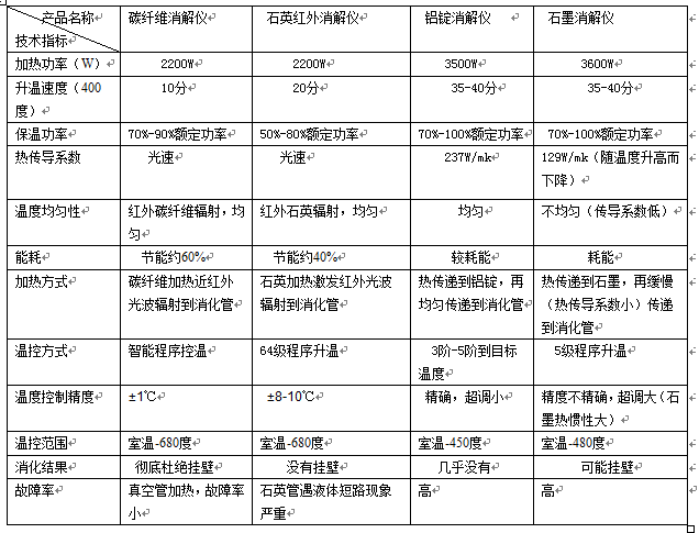 凱氏定氮儀原理,在做定氮前,我們先要做樣品的消解前處理。那么先從消解儀說起,消解儀還有一個別名叫消化爐。消解儀適用于食品、醫(yī)藥、農(nóng)業(yè)、林業(yè)、生化等行業(yè)以及高等院校、科研部門對種子、土壤、植株、飼料、食品、礦石等化學(xué)分析之前的樣品消解處理。目前市面上的消解儀分為石墨消解儀,鋁錠消解儀,遠紅外消解儀,碳纖維消解儀。這么多不同叫法的消解儀,到底我們使用那種的好呢?我給大家做了一張對比表,根據(jù)自己的使用需求,選擇適合自己產(chǎn)品。