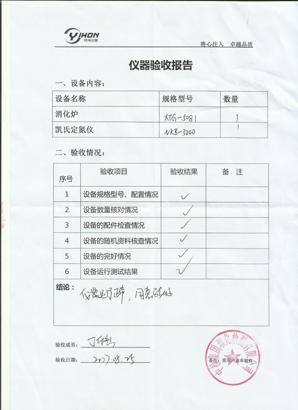 中檢集團理化檢測有限公司采購上海祎鴻提供的凱氏定氮儀NKB3000,紅外消消化爐XTG5081設備,主要針對土壤等來料的蛋白質含量檢測,已順利完成驗收工作。