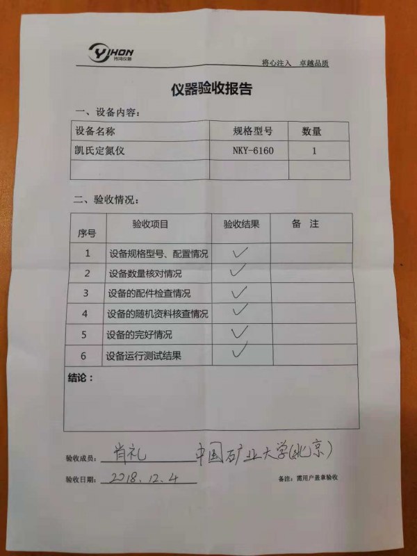 近期,上海祎鴻和中國(guó)礦業(yè)大學(xué)(北京)達(dá)成合作,產(chǎn)品凱氏定氮儀NKY-6160順利通過(guò)驗(yàn)收。
