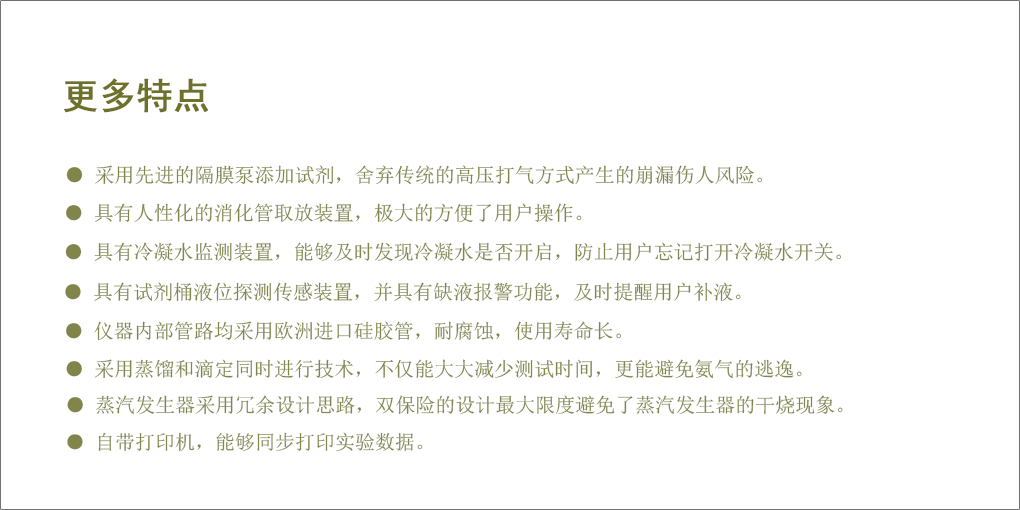 全自動設(shè)計 | 自動完成樣品稀釋、加酸、加堿、蒸餾、滴定、反應(yīng)杯排空和清洗、自動校正、結(jié)果計算及輸出打印,無須人為干預(yù)。內(nèi)置多種常規(guī)使用方法。 |