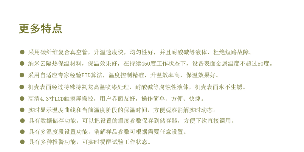 首次采用碳纖維復(fù)合真空加熱技術(shù),升溫效率高,溫度均勻性好。采用行業(yè)領(lǐng)先的納米云隔熱材料,熱效率高,節(jié)能環(huán)保。更具有4.3寸高清LCD觸摸屏操控界面,簡(jiǎn)單易懂,并具實(shí)時(shí)顯示溫度曲線功能,摒棄了以往溫控表頭繁瑣的操作。 XTG5000適用于食品、醫(yī)療、農(nóng)業(yè)、林業(yè)、生化等行業(yè)已經(jīng)高等院校、科研部門(mén)對(duì)種子、土壤、植株、飼料、礦石等化學(xué)分析之前的樣品消解處理 |
